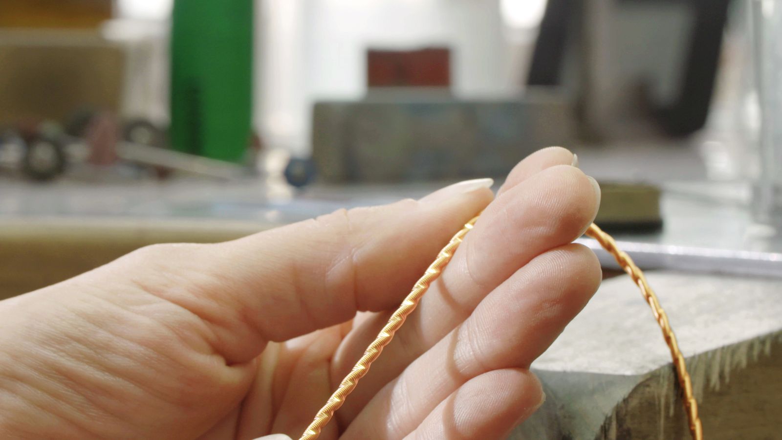 Wie in einem Märchen wird 18-karätiges Gelbgold und 18-karätiges Weissgold zu hauchdünnen Fäden gesponnen, die von Hand zu geschmeidigen Kordeln gedreht werden.