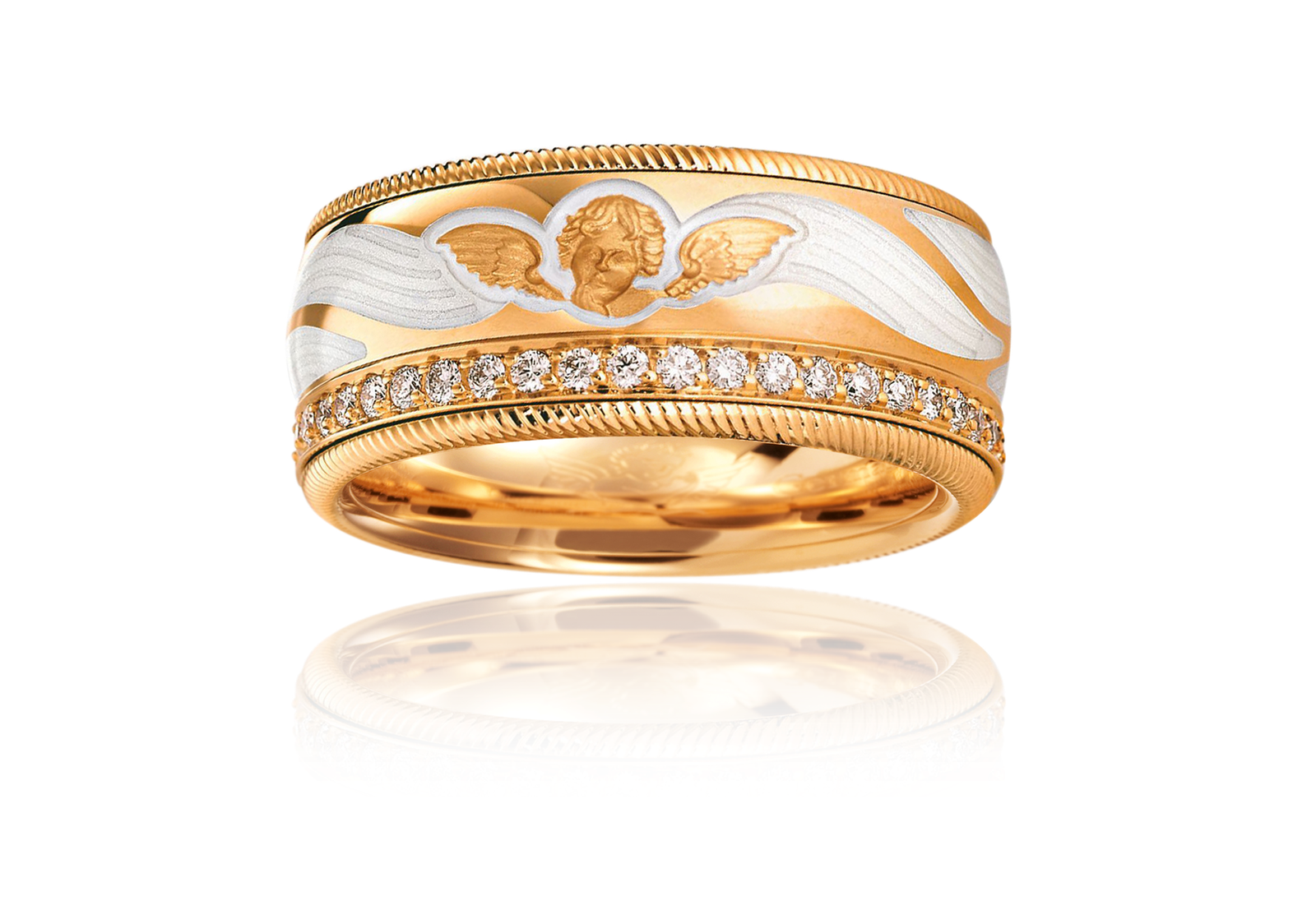 Seinen besonderen Charme entfaltet der Ring durch die weiß schimmernde Wellendorff-Kaltemaille, deren Glanzeffekt an feinen Sternenstaub erinnert. Die transluzente Kaltemaille lässt auch die Ebenen des im Untergrund handgravierten Flügelmotivs auf raffinierte Weise durchscheinen.