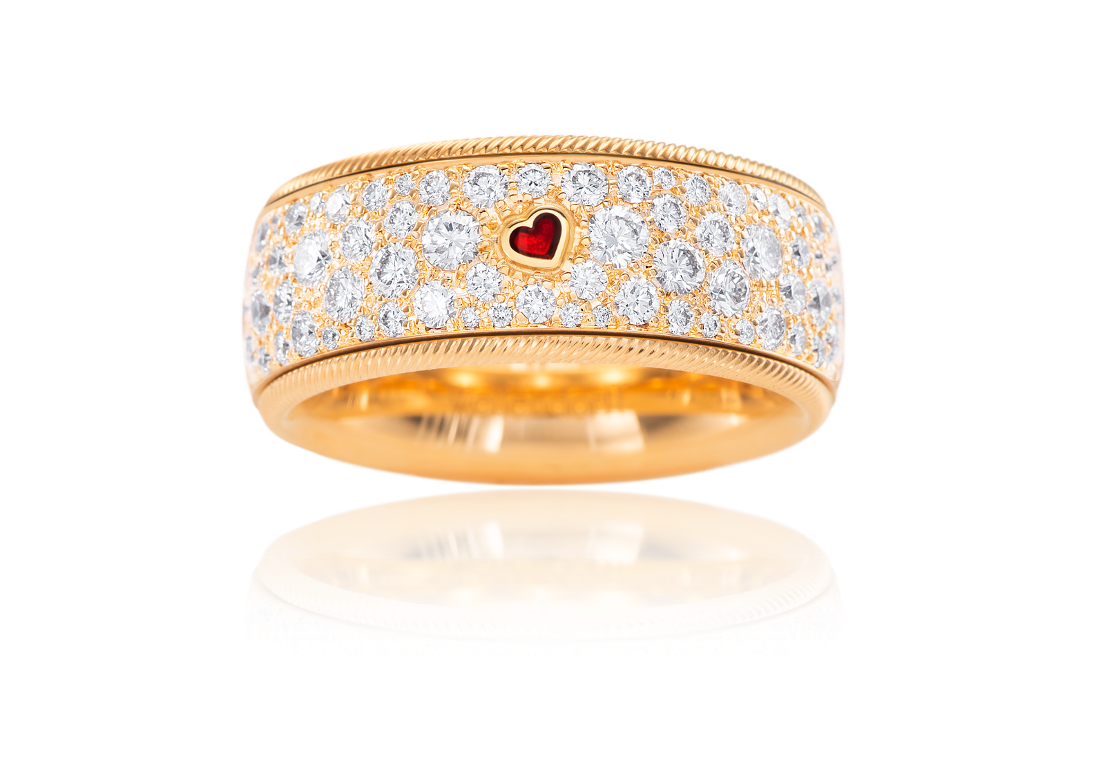 A small heart made of red Wellendorff cold enamel sets it apart. It is artfully placed amongst the densely set diamonds, requiring exceptional precision and years of experience.